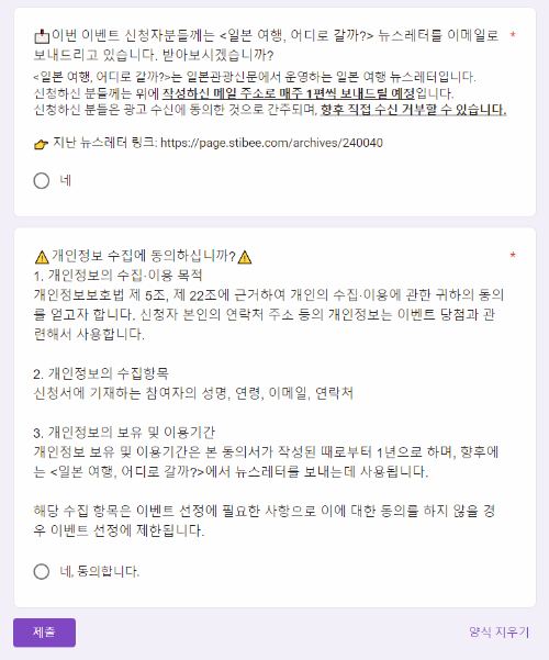 ④ 이름, 연령대, 이메일, 인스타그램 등 내용을 입력한 후 뉴스레터, 개인정보 수집 내용을 확인한 후 [제출] 버튼을 누릅니다