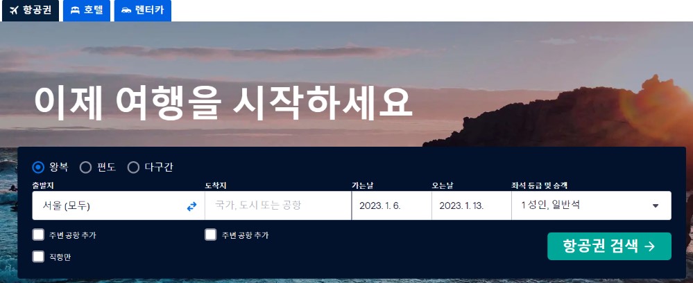 해당 홈페이지에 접속하면 항공권 / 호텔 / 렌트카 세 가지 카테고리가 보이는데, 이번에는 항공권 탭을 검색하는 방법을 알아보겠습니다. 스카이스캐너에 접속하면 왕복 / 편도 / 다구간 선택부터 출발-도착지, 가는 날-오는 날 등 다양한 옵션 선택이 가능합니다.
