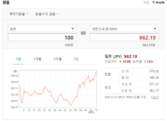 아래 화면은 검색 사이트에 '환율 계산기'를 검색하면 나오는 환율 정보로, 환전을 준비하게 되면 꽤 자주 검색하게 되는 내용입니다. 보통 100엔 = 1,000원으로 기준을 잡았을 때 2023년 1월 현재는 전일 대비 제법 상승했지만 여전히 엔화 약세로 볼 수 있으며 이러한 엔저 현상은 여행객에게는 반가운 일이기도 하죠.