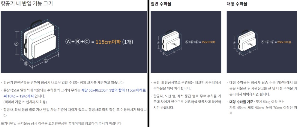 ① 항공기 내 반입 가능 크기 = 기내 수하물 / ② 일반 수하물, 대형 수하물 = 위탁 수하물로 이해하면 됩니다.