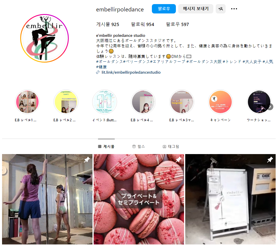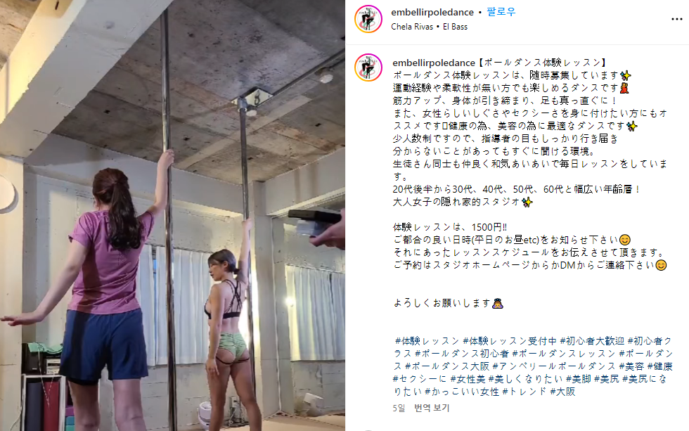 일본 오사카 이색 체험 폴댄스 스튜디오 e'mbellir poledance studio 체험레슨 예약 방법