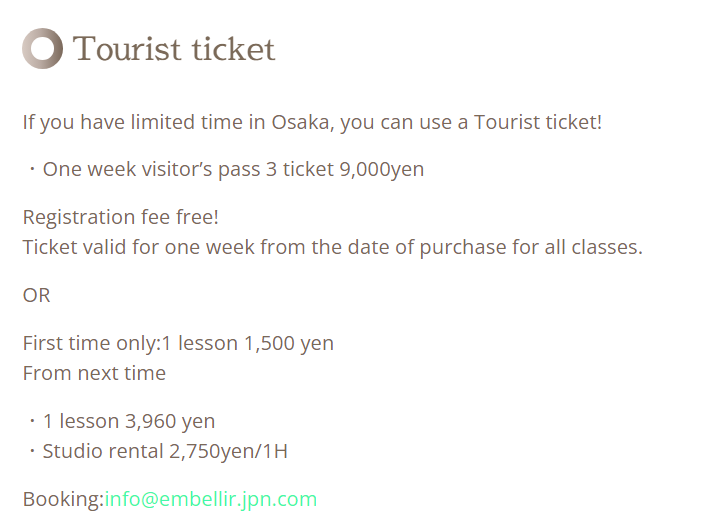 만약 다양한 수업을 좀 더 저렴하게 수강하고 싶다면 투어리스트 티켓을 이용하면 되는데요. 투어리스트 티켓은 일주일 동안 3회의 수업을 9,000엔에 들을 수 있기 때문에 본인 일정에 맞춰 선택할 수 있다는 장점이 있습니다.