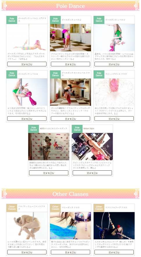 일본 오사카에 위치한 e'mbellir Poledance studio (이하 앙벨리르 폴댄스 스튜디오)에서는 스태틱폴, 스피닝폴, 힐을 신고 폴을 타는 힐클래스 등 폴댄스 클래스 외에도 벨리댄스, 에어리얼 후프, 플라잉 요가 등 다양한 수업 클래스들이 마련되어 있는데요.