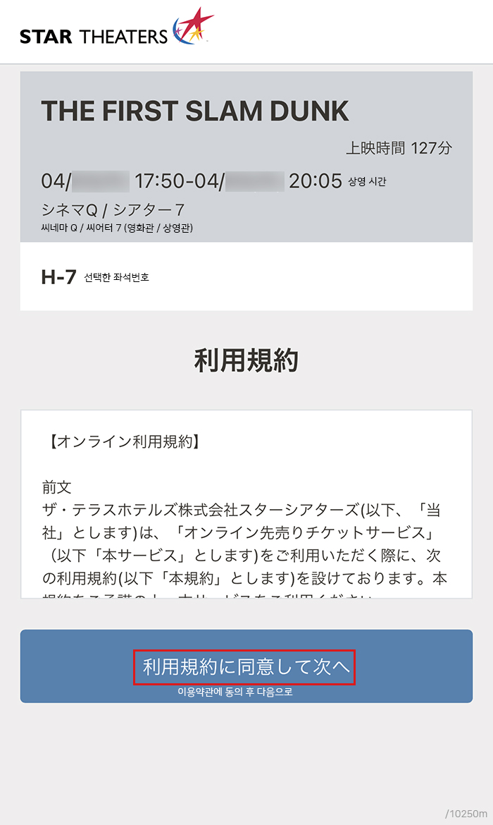 영화 일정 및 좌석을 확인한 후, 변동사항이 없으면 화면 아래 '이용약관에 동의한 후 다음으로' 버튼을 눌러줍니다.