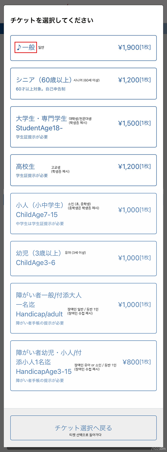 할인 등의 서비스를 이용할 수 없는 일반 성인이라면 화면에 표시한 일반(一般) 항목을 누릅니다.
