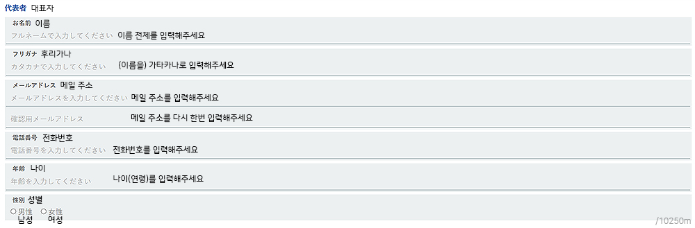 스크롤을 내려 대표로 예약을 진행하는 대표자의 이름, 메일주소, 전화번호, 나이, 성별을 입력해줍니다.