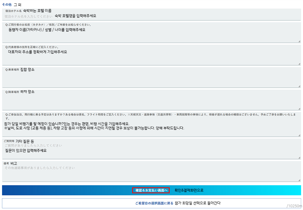 이어서 숙박호텔명, 동행자 정보, 대표자 거주지 주소, 투어 집합&하차장소 외 질문들에 대한 답변을 입력합니다. 해당되는 사항이 없더라도 필수적으로 모든 답변을 입력해야 하기 때문에 유의해주시기 바랍니다.