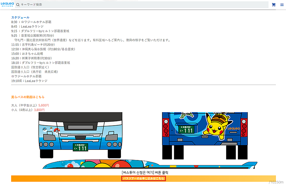 LeaLea OKINAWA의 여러 상품들 중 <하늘 나는 피카츄 프로젝트> 랩핑버스가 있는 1일 관광투어 (츄라버스) 페이지에 접속합니다. (해당 상세 페이지 바로가기)