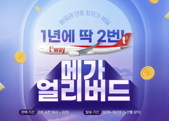 이번에 소개해드릴 내용은 티웨이항공사의 메가 얼리버드 이벤트인데요. 자세한 내용 함께 보시겠습니다.